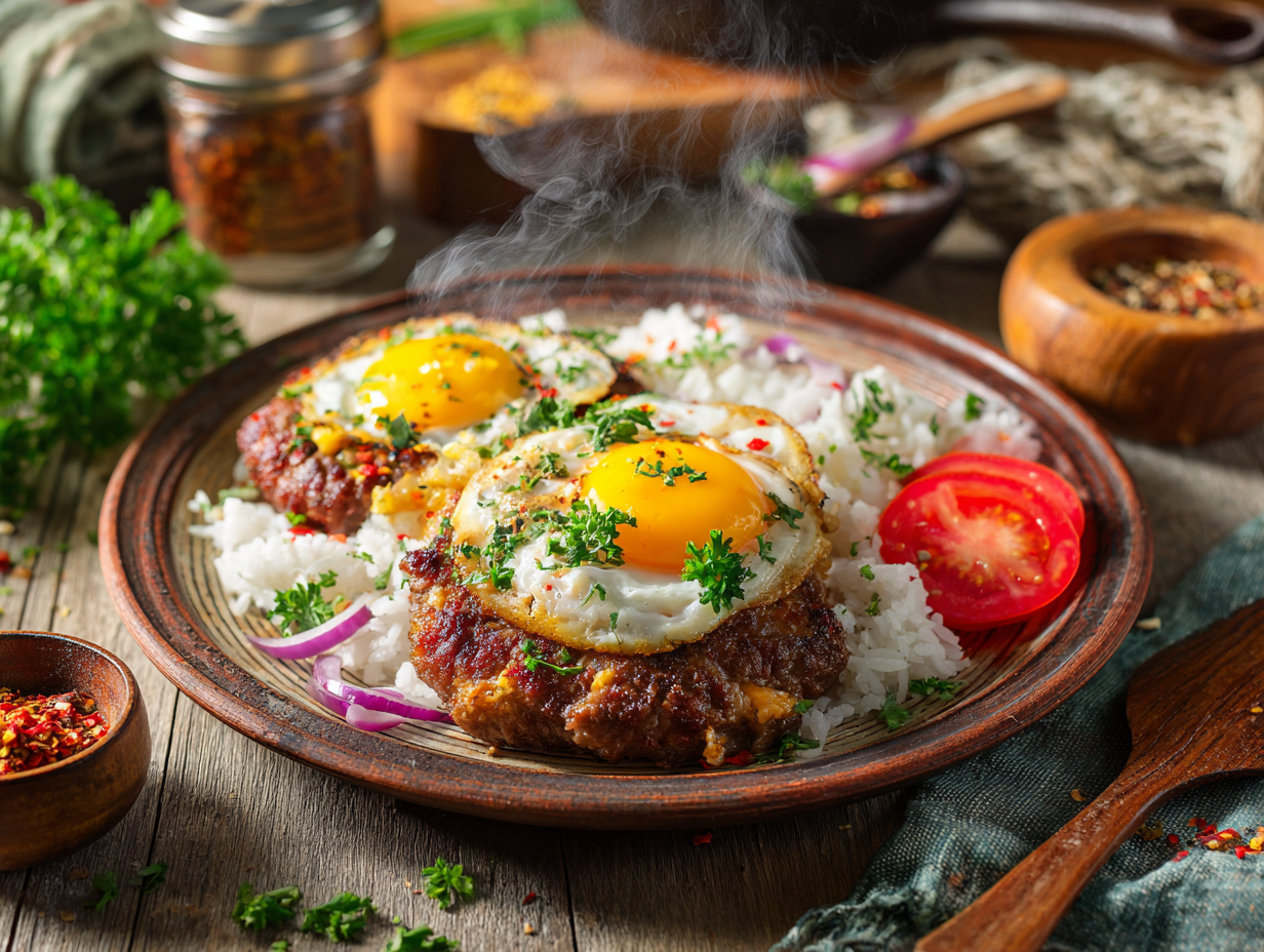 - Place one fried egg on top of each finished beef patty. Serve warm over a bed of rice if desired. Garnish with sliced tomatoes, red onion, and chopped parsley.