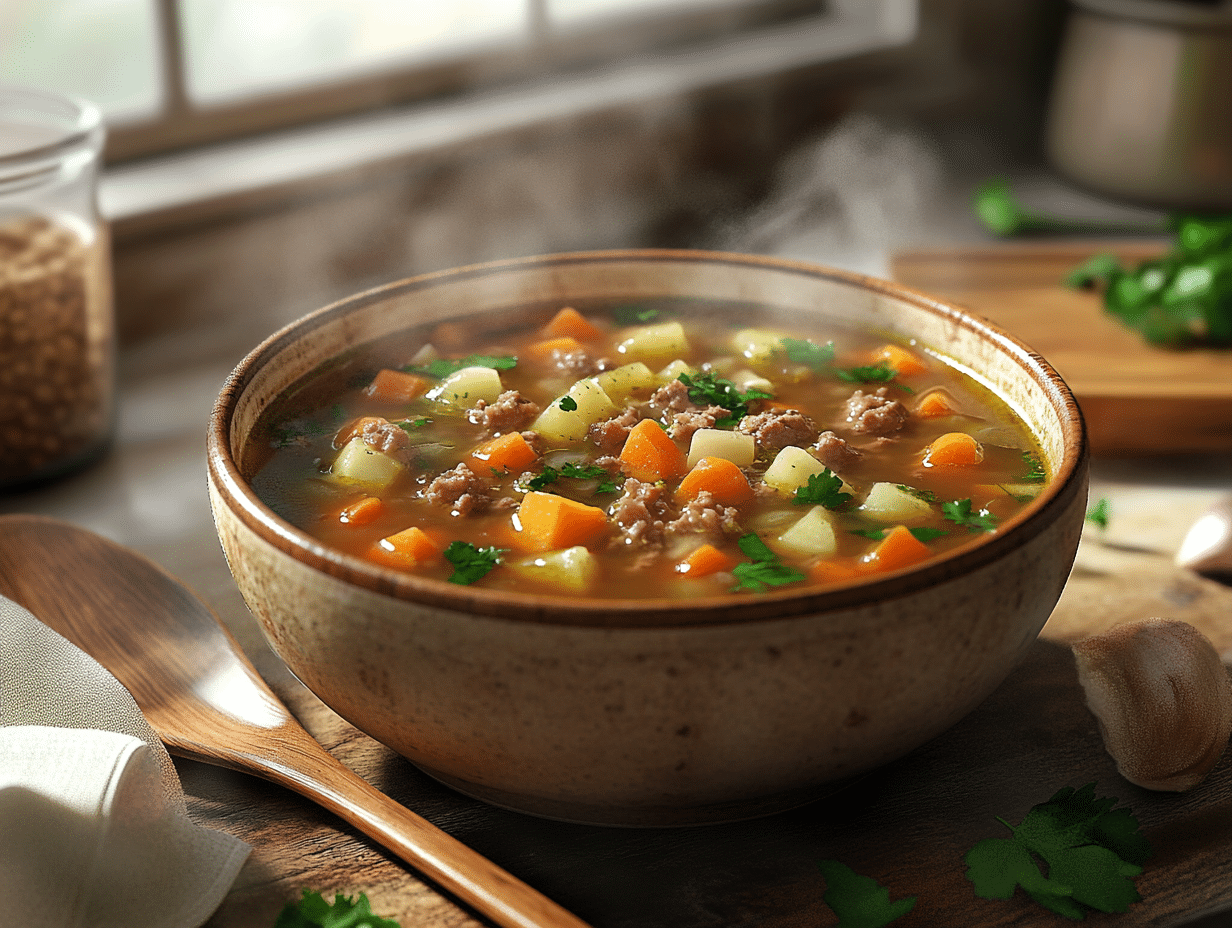 Minced Beef and Vegetable Cuchuco Soup is a dish that holds its roots in the Andes Mountains of South America, a region renowned for its wealth of ancestral ingredients and traditions. This recipe takes inspiration from cuchuco, a traditional Andean soup that has been cherished for centuries as a hearty and nutritious meal. The term “cuchuco” refers to a blend of grains—commonly corn, barley, and wheat—that has long been a staple in Andean households. These grains, revered for their dense nutritional value and earthy flavors, provide the foundation for this comforting dish.