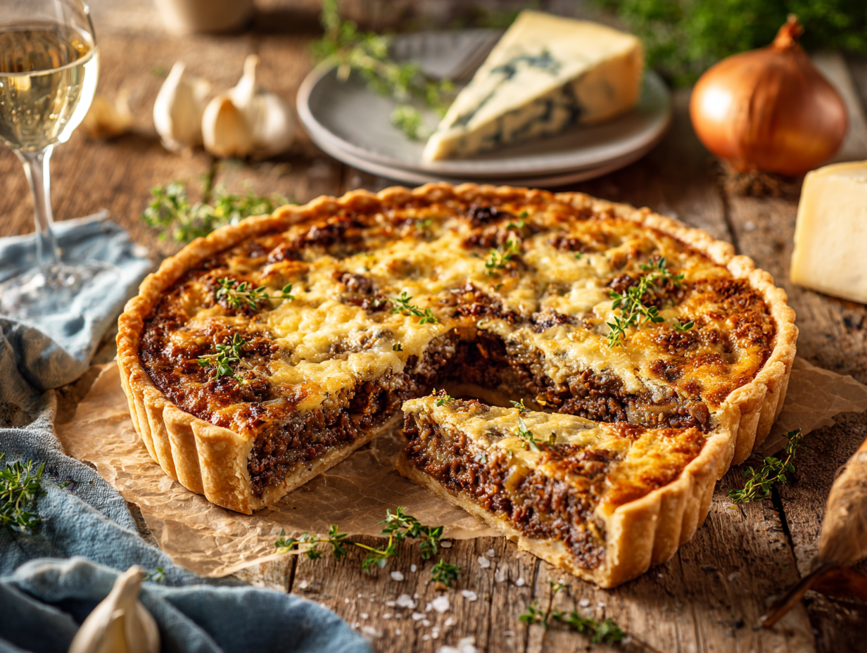 The Beef Mince and Roquefort Quiche is a modern twist on a classic French dish, merging rustic sensibility with bold, refined flavor. At its core, quiche is a savory custard pie that originated in the Lorraine region of France. Traditionally made with eggs, cream, and bacon in a pastry crust, the classic quiche Lorraine has provided the foundation for countless savory interpretations, each reflecting regional ingredients or personal culinary creativity. The version here—featuring ground beef and Roquefort—leans into that heritage while adding its own decadent depth and robust profile.