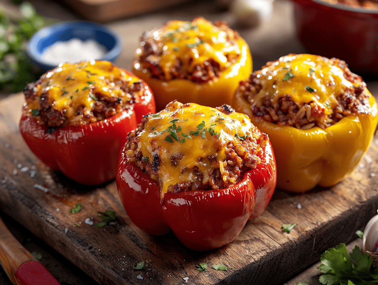 The addition of cooked rice to the mixture ensures that the filling is hearty and balanced, making it a complete meal on its own. Topping the peppers with aged cheddar cheese amplifies the overall richness, giving each bite the perfect balance of creamy, smoky, and savory flavors. The cheese melts and browns beautifully in the oven, creating a golden crust that adds both texture and visual appeal.