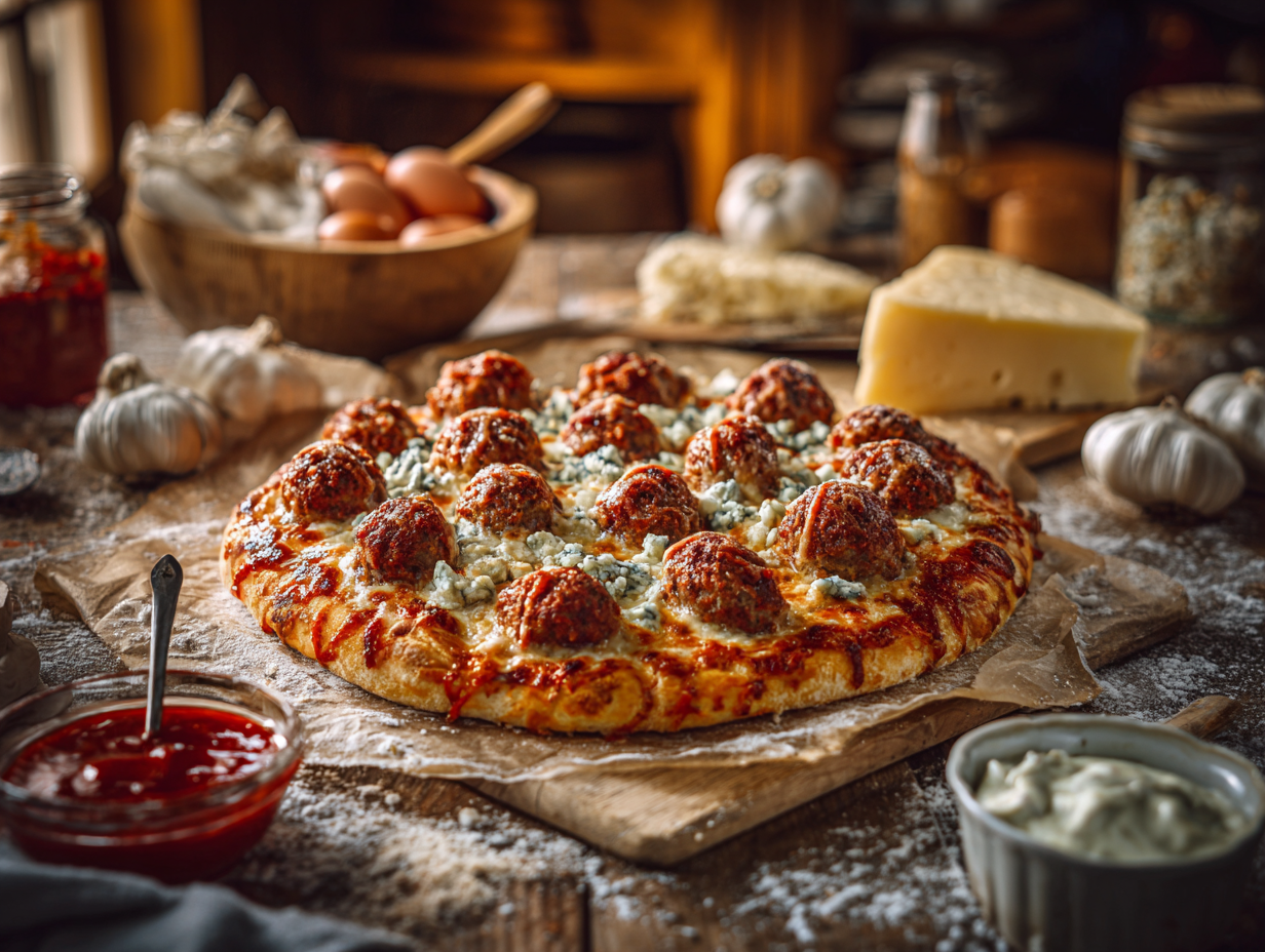 The inspiration for this pizza comes from the popularity of buffalo wings, often served as appetizers at sports bars and parties. They are tangy, spicy, and usually paired with blue cheese or ranch dressing. Translating this addictive flavor profile into something that could serve as a whole meal was the goal. Meatballs bring the satisfying, protein-heavy heartiness needed to make it more filling, while still being small and tender enough to spread evenly across the pizza. The baking process also allows those flavors to caramelize slightly and blend into the cheese and sauce, creating bursts of bold taste in every bite.