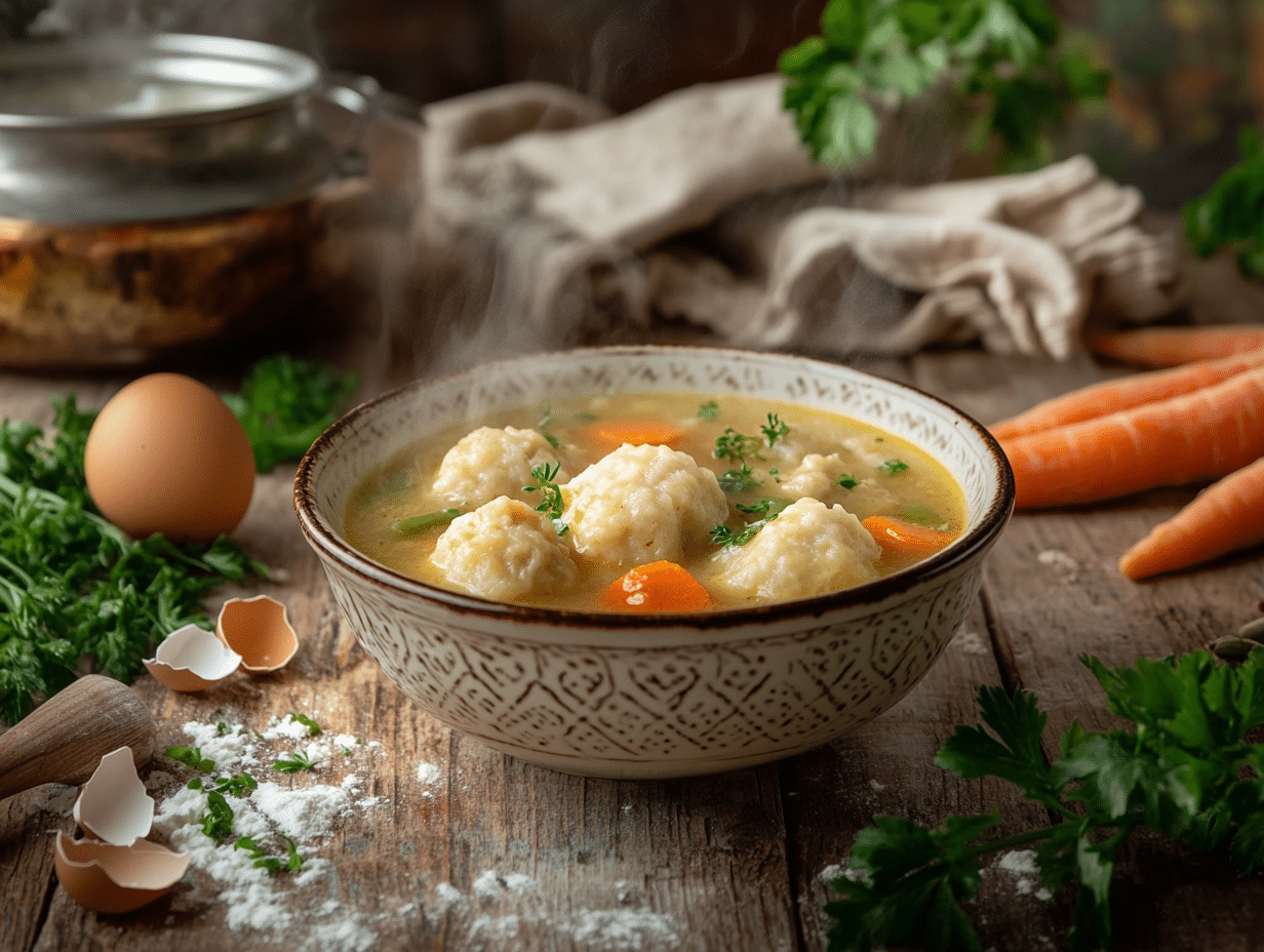 While chicken soup can be found in cultures around the world—from Jewish matzo ball soup to Asian chicken and rice combinations—this version maintains a humble, rustic character. The dumplings, made from just semolina, egg, and a pinch of salt, puff up into soft, pillowy bites that turn a clear, golden broth into a hearty and satisfying meal. They’re not noodles, but they served a similar purpose when options were limited, and over time, they developed into a beloved choice in their own right.