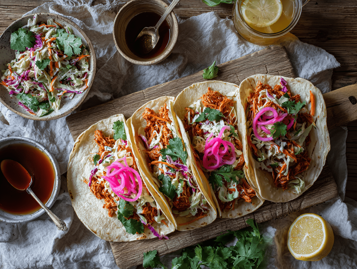The addition of pickled onions and fragrant cilantro as garnishes introduces brightness and herbaceous notes to round out the dish. Served in warm corn tortillas, each bite delivers layers of flavor — the smoky-sweet ketjap chicken, the cool crunch of the slaw, the tang of pickled onions, and the citrusy herbal lift from the cilantro. It’s an inviting, multi-textured experience.