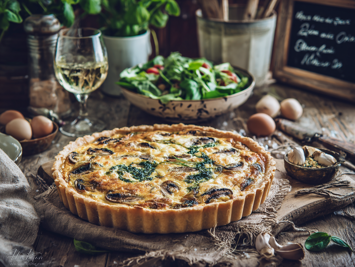 The custard base, made of whisked eggs and milk or half-and-half, binds the quiche together. Here, a touch of nutmeg makes its gentle, almost imperceptible presence felt—those who notice it will appreciate the culinary finesse, and those who don’t will simply enjoy its warming effect. Combined with just a pinch of salt and pepper, this custard breathes cohesion into the eclectic mix of ingredients.