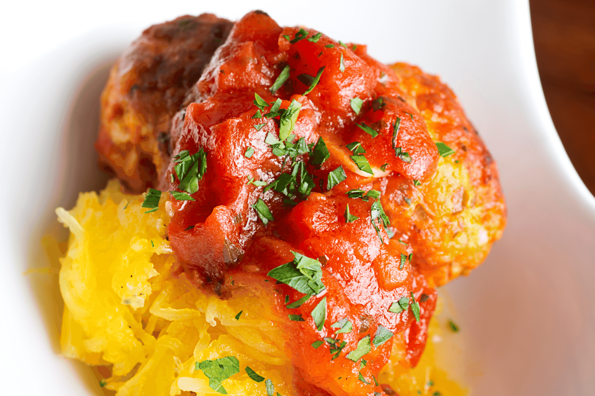 - Brown thoroughly on both sides and make sure they are cooked through. Place squash on plates. Top squash with sauce, then meatballs and serve hot.