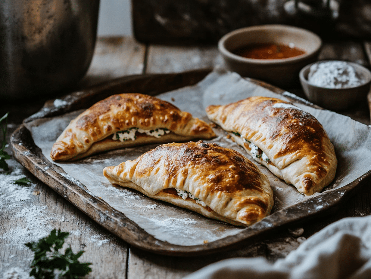 - Fold the dough over the filling, crimping the edges to seal the calzones. Place them on a baking sheet lined with parchment paper.