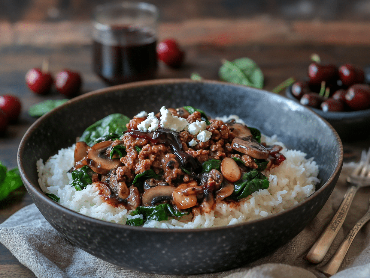 The Spicy Lamb Stir Fry Rice Bowl is a bold, flavorful dish that brings together the rich, aromatic taste of ground lamb with a blend of spices, sautéed vegetables, and a unique cherry balsamic reduction. Inspired by Asian stir-fry techniques, infused with Mediterranean seasoning, and finished with a slightly sweet and tangy sauce, this dish showcases a global fusion of flavors that will both surprise and satisfy your taste buds.