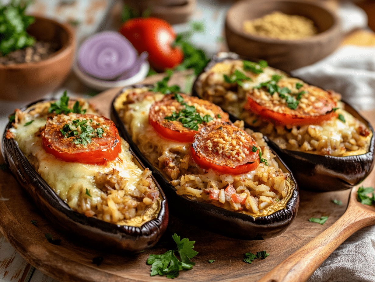 Preparation is straightforward, making this a great dish for a weeknight meal. The eggplants are hollowed out, ensuring every bite has an even balance of stuffing and eggplant. The filling comes together quickly in a pan, and after baking, the melted cheese and roasted tomato slices make this meal both comforting and impressive in presentation.