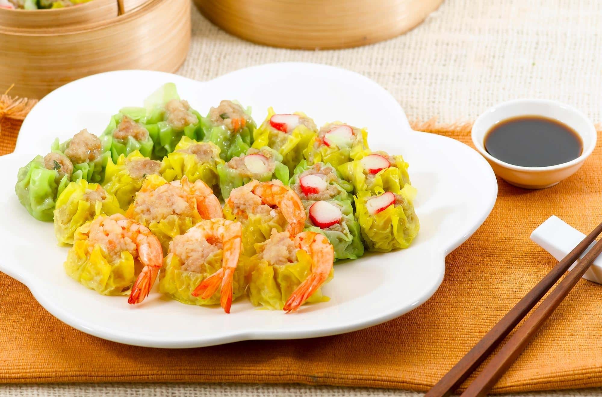 - Make the dim sum dumpling: Place a sheet of wonton skin on your palm; put about 1 teaspoon of meat mixture in the middle of the skin. Add 1 shrimp to the top of the meat with the tail up. Gather edges of the skin together around the tail of the shrimp. Place dim sum into the steamer and open the tail like a fan. Steam all for 20-25 minutes.