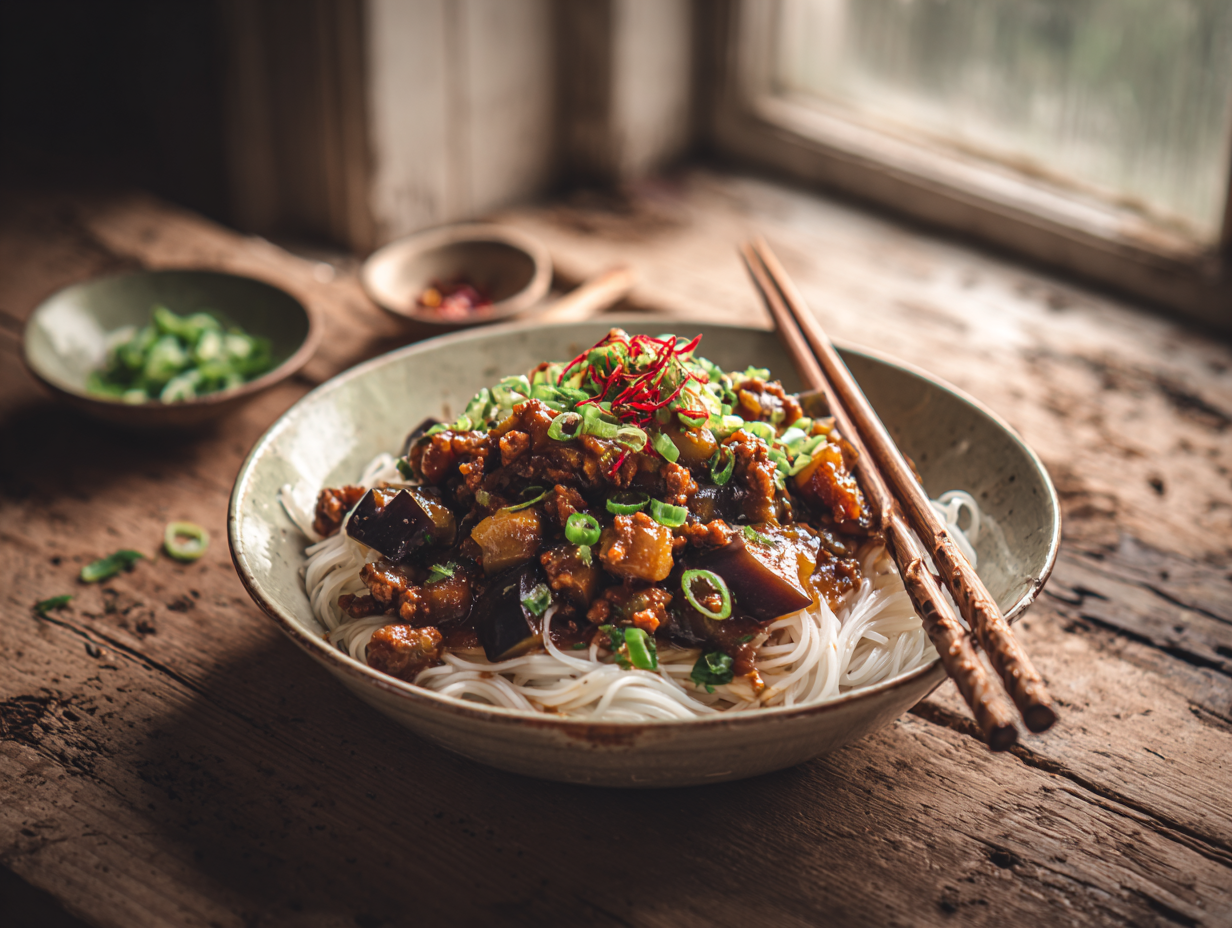 When I first tasted this delicious pork mince with eggplant and rice noodles, it was one of those meals that instantly transports you—not just to a different kitchen, but to a different way of thinking about everyday ingredients. Pork mince is something many of us grow up with. It’s affordable, versatile, and reliable. Eggplant, too, is widely available and often underrated. Yet when these two humble ingredients are brought together with fragrant seasonings and soft rice noodles, they transform into something deeply comforting and surprisingly sophisticated.