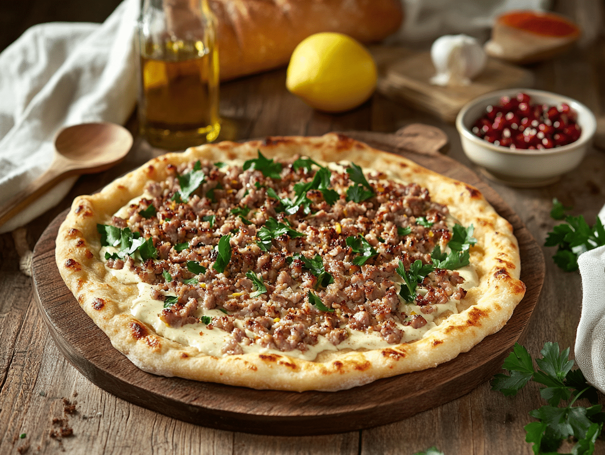 The tahini sauce, drizzled generously across the flatbread, adds an essential layer of flavor and creaminess. Made from toasted sesame seeds, tahini is a quintessential ingredient in Middle Eastern cooking. It brings nutty depth and a velvety texture to the dish, harmonizing beautifully with the spicy, savory pork topping. A splash of bright, zesty lemon juice in the tahini sauce is crucial—it cuts through the richness of both the meat and the sauce, enhancing the overall balance of the dish. The finished sauce is silky smooth and lightly salted, ensuring it complements the bold flavors without overpowering them.