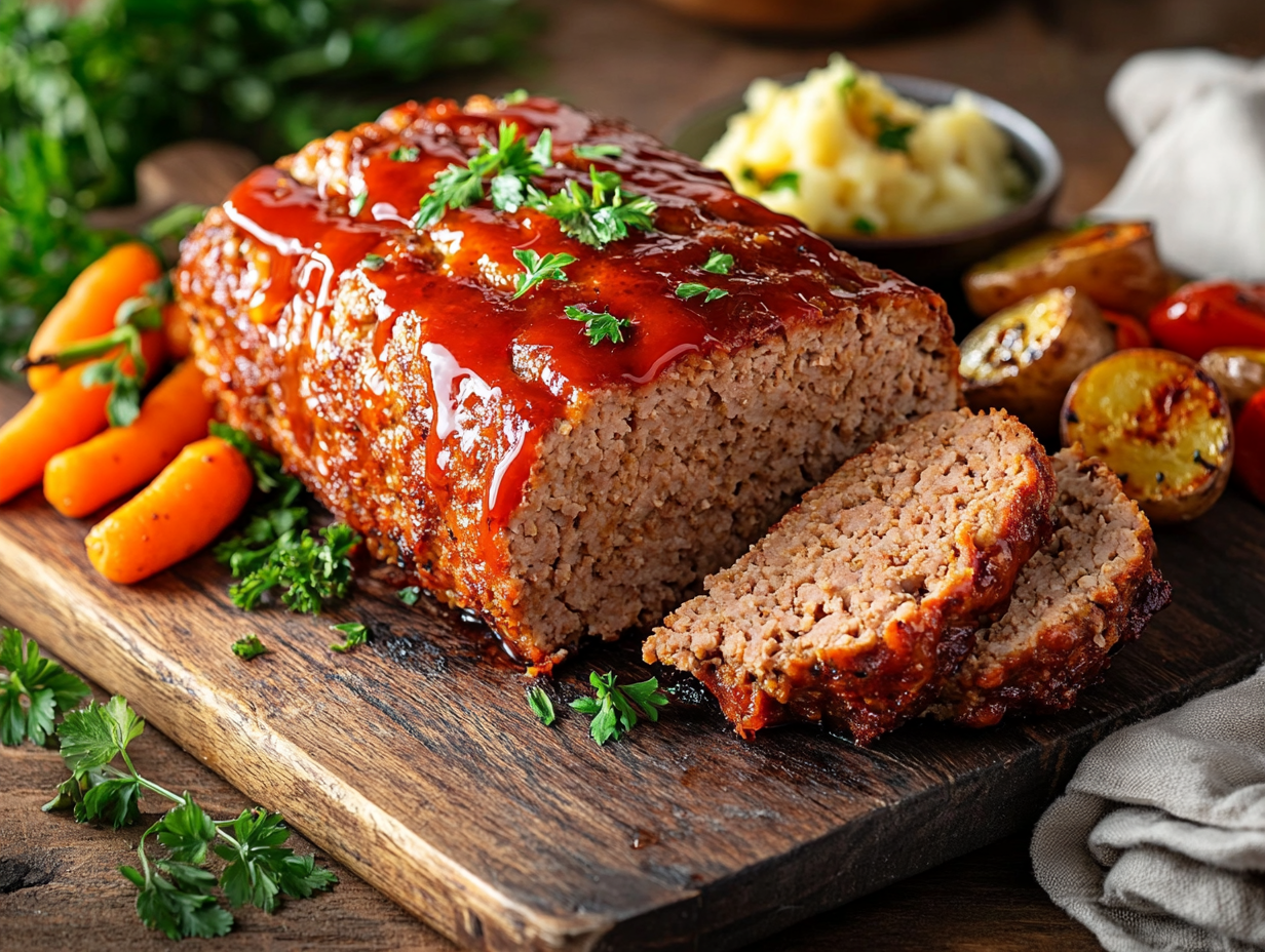 One standout feature of this meatloaf is the glaze—a zesty mix of ketchup and hot sauce slathered over the top before baking. As it roasts, the glaze caramelizes slightly, creating a tangy, spicy-sweet crust that contrasts beautifully with the tender interior. It also gives you that classic tomato-topped look that signals home-cooked comfort.