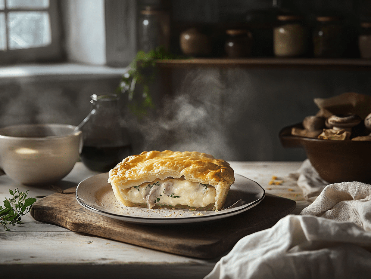 The presentation of this dish in pie form is another nod to a rich culinary heritage. Pies have been a quintessential part of European cuisine for centuries, offering not only a way to stretch ingredients but also a comforting and portable meal. The versatile shortcrust pastry used here is buttery, tender, and the perfect vessel for encasing the rabbit filling. Spiced with tarragon, enriched by the cream, and accented with a splash of white wine, the filling embodies the balance of flavors typical of French bistro fare: earthy mushrooms, sweet onions, and a touch of acidity from the wine elevate the savory rabbit meat while providing a silky, luxurious finish.